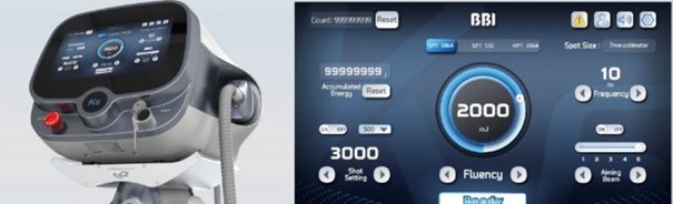 - Intelligente Umschaltung zwischen 3 Modis SPT 1064 ( 1000MJ), SPT 532 (400MJ) & HPT 1064 (1500MJ)